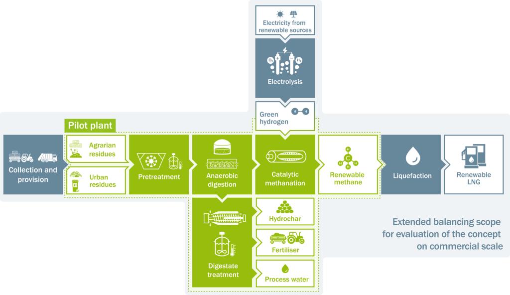 The pilot plant was planned, constructed, and commissioned at the DBFZ site as part of the Pilot-SBG research and demonstration project. The use of agricultural residues and municipal waste will be demonstrated in initial test campaigns. The integrated, automated, and digitalised plant concept combines both established and innovative technologies. It can process biogenic residues, by-products, and waste to produce renewable methane as the main product using green hydrogen. Thanks to its modular design, it can not only be flexibly combined and expanded, but also optimally integrated into the DBFZ’s research infrastructure and expertise. Process engineering research and development builds upon the scaling of the individual processes, which have already been established in multi-stage scaling at a smaller laboratory and pilot plant scale at the DBFZ. The process technology expertise at the DBFZ provides a solid foundation for potential expansion modules and the continued development of the research and development platform. Data acquisition and processing enable real-time measurement of parameters and process monitoring through extensive measuring points. This capability is supported by the DBFZ’s comprehensive analytics portfolio, which leverages its in-house laboratories. The robust data foundation facilitates iterative, real-time process optimisation and serves as the basis for modeling and simulating a digital twin. This digital twin enables the integration and advancement of AI-based process control. Additionally, the resulting mass and energy balances underpin the technical, economic, and ecological assessments. The multi-criteria assessment of supply chains includes not only an ecological evaluation focusing on greenhouse gas emissions but also an analysis of cost-revenue structures in the context of existing and foreseeable framework conditions. This approach identifies optimization potential not only for individual processes but also for interfaces and interactions within the process chain. Upstream and downstream steps, which are not directly demonstrated at the pilot plant, are also analysed with a view towards potential implementation on a commercial scale. The system integration of the concepts involves contextualising the results. The broad expertise of the DBFZ team allows for addressing questions related to mobilisation of the resource potential or integration of renewable hydrocarbons into existing infrastructure. The focus is on advancing and integrating the concept to contribute to a cross-sectoral sustainable bioeconomy and to provide high-quality co-products based on potential demand and market developments. The pilot plant is intended to evolve into a central component of an R&D technology platform for further research and development projects with industry and scientific partners. The high flexibility of the plant regarding the addition of new, innovative modules and the ability to detach individual plant components from the process chain and to operate them separately is an advantage. Furthermore, the integration within the DBFZ enables the comprehensive evaluation of promising technical innovations supporting market integration and making a meaningful contribution to the defossilisation of products.